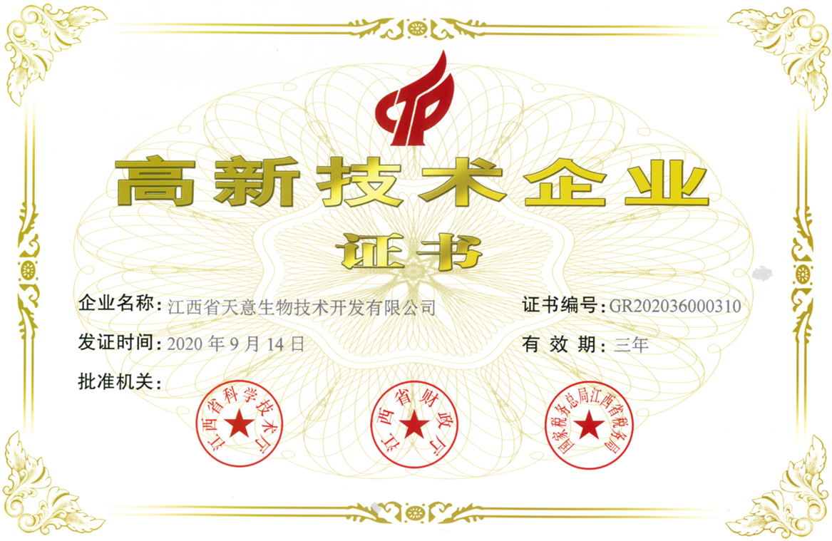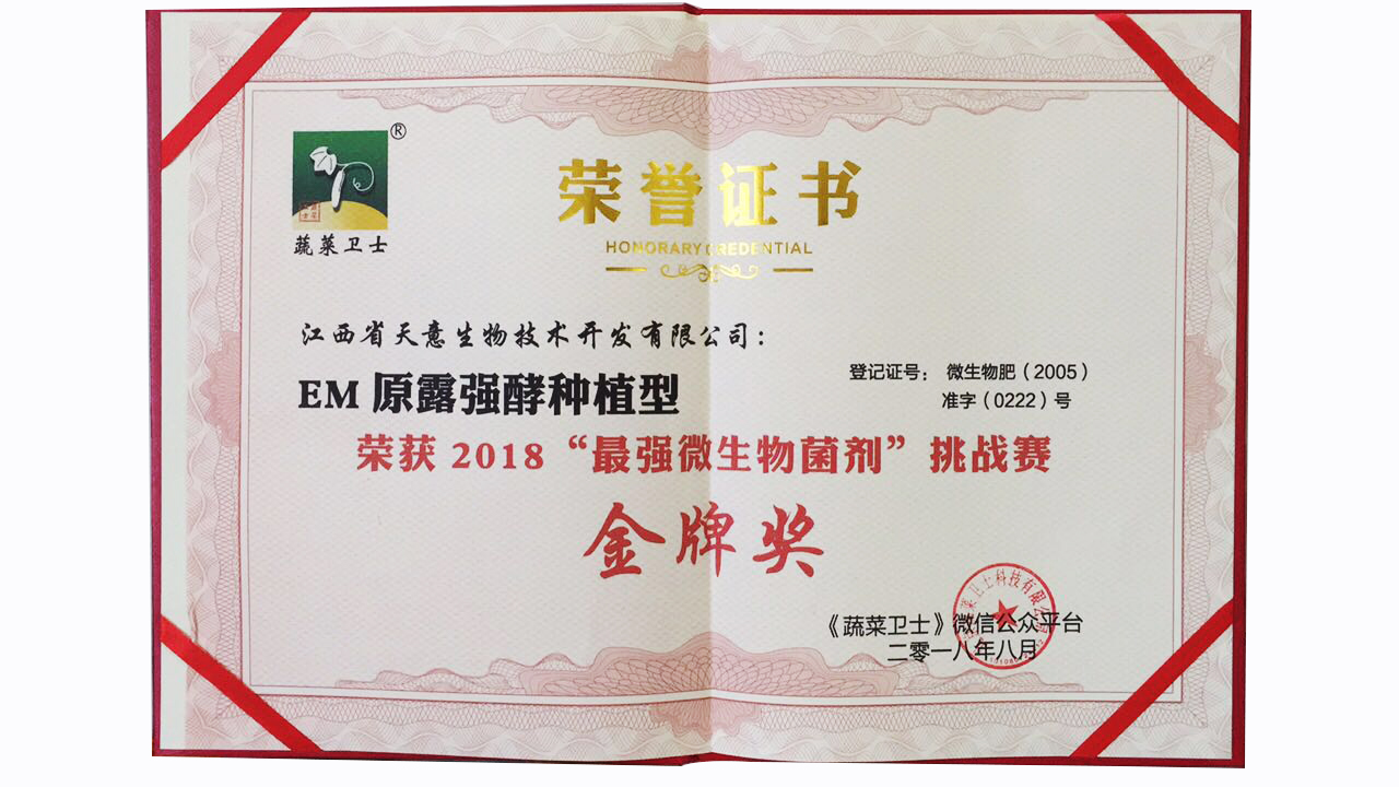 2000年,天意企業(yè)獲得高新技術(shù)企業(yè)稱(chēng)號(hào),之后每隔三年直至今天均連續(xù)獲得國(guó)家高新技術(shù)企業(yè)稱(chēng)號(hào)。同年,EM原露獲得省科技廳頒發(fā)的“優(yōu)秀新產(chǎn)品”證書(shū)。