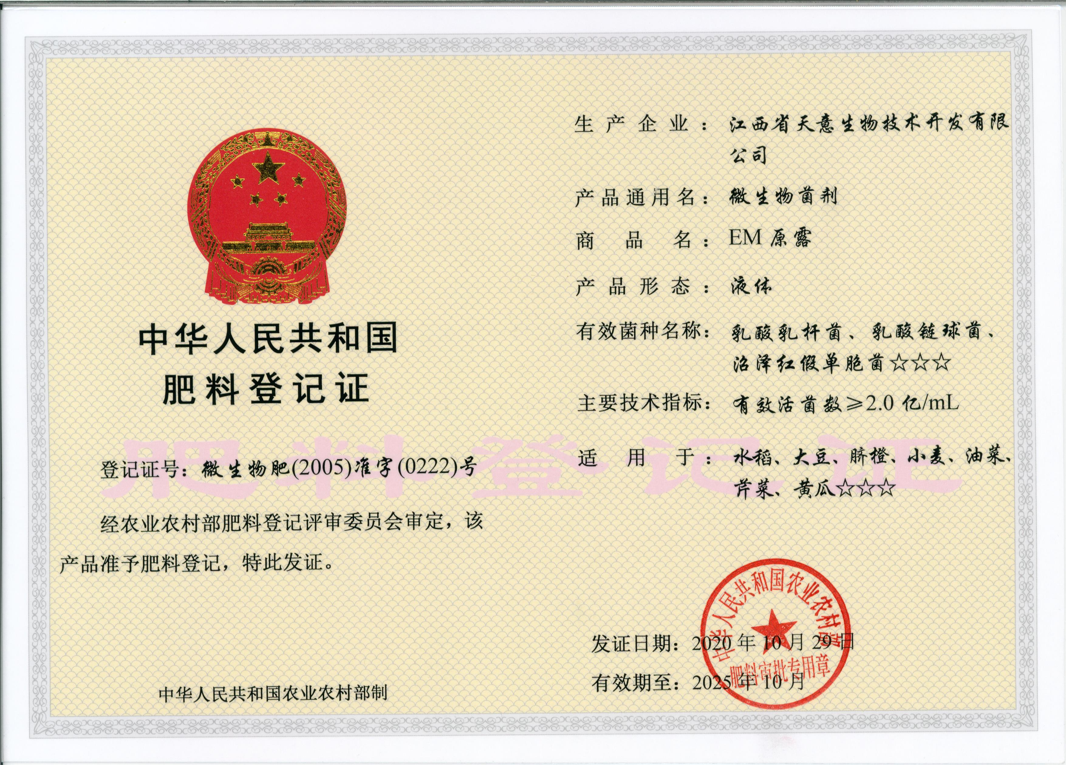 2001年,EM原露獲得農(nóng)業(yè)部下發(fā)的飼料添加劑生產(chǎn)許可證和微生物肥料登記證。