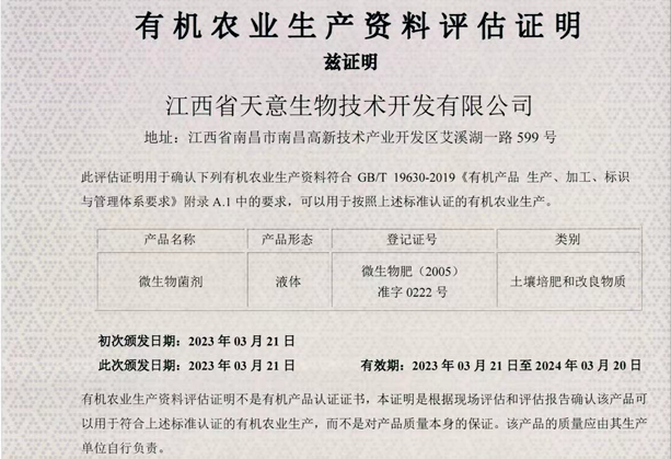 1996年3月,江西省天意生物技術(shù)開(kāi)發(fā)有限公司成立,與此同時(shí),日本自然農(nóng)法(財(cái)團(tuán))津曲智先生來(lái)江西考察,了解EM技術(shù)產(chǎn)業(yè)化的準(zhǔn)備工作。