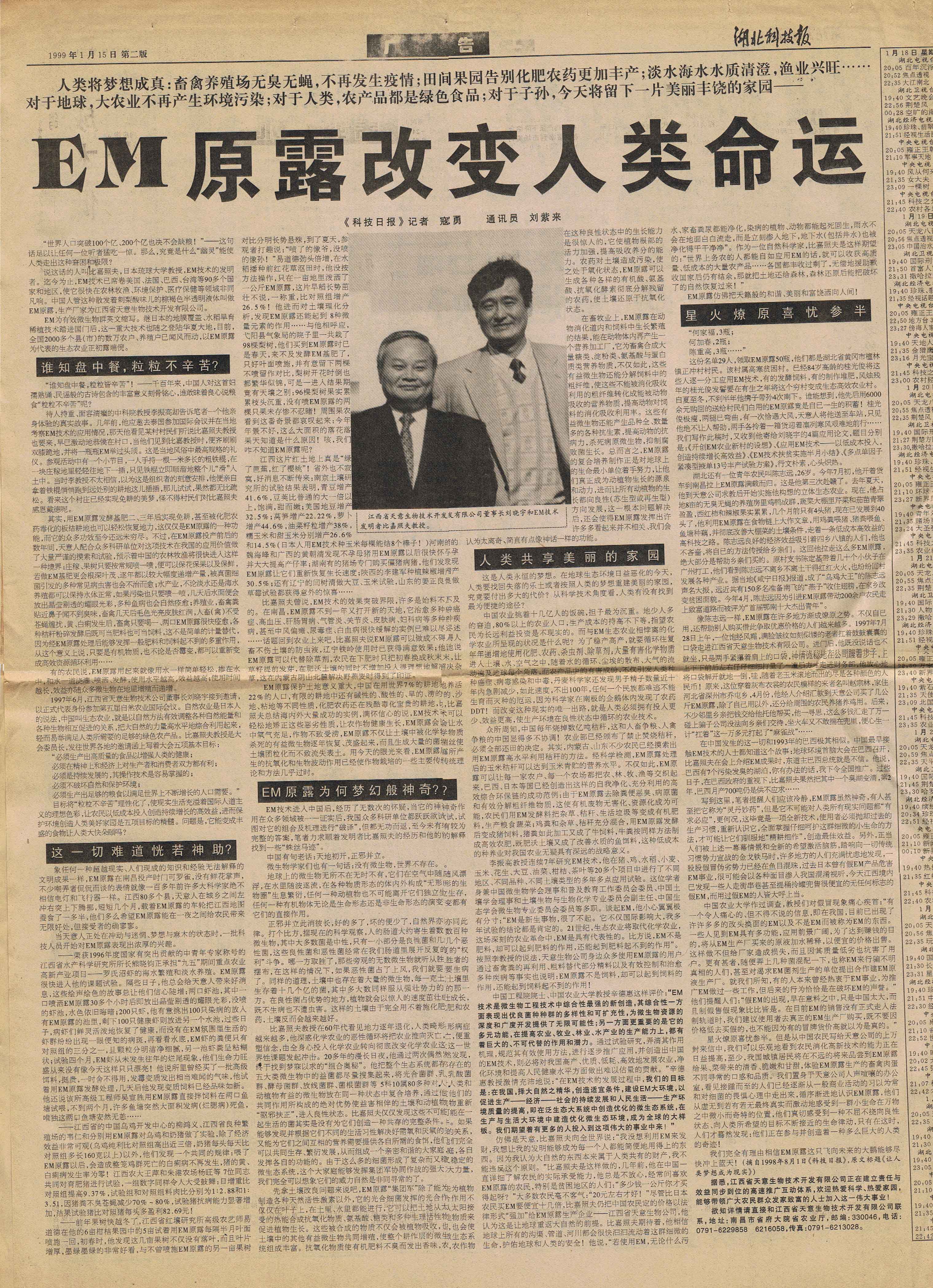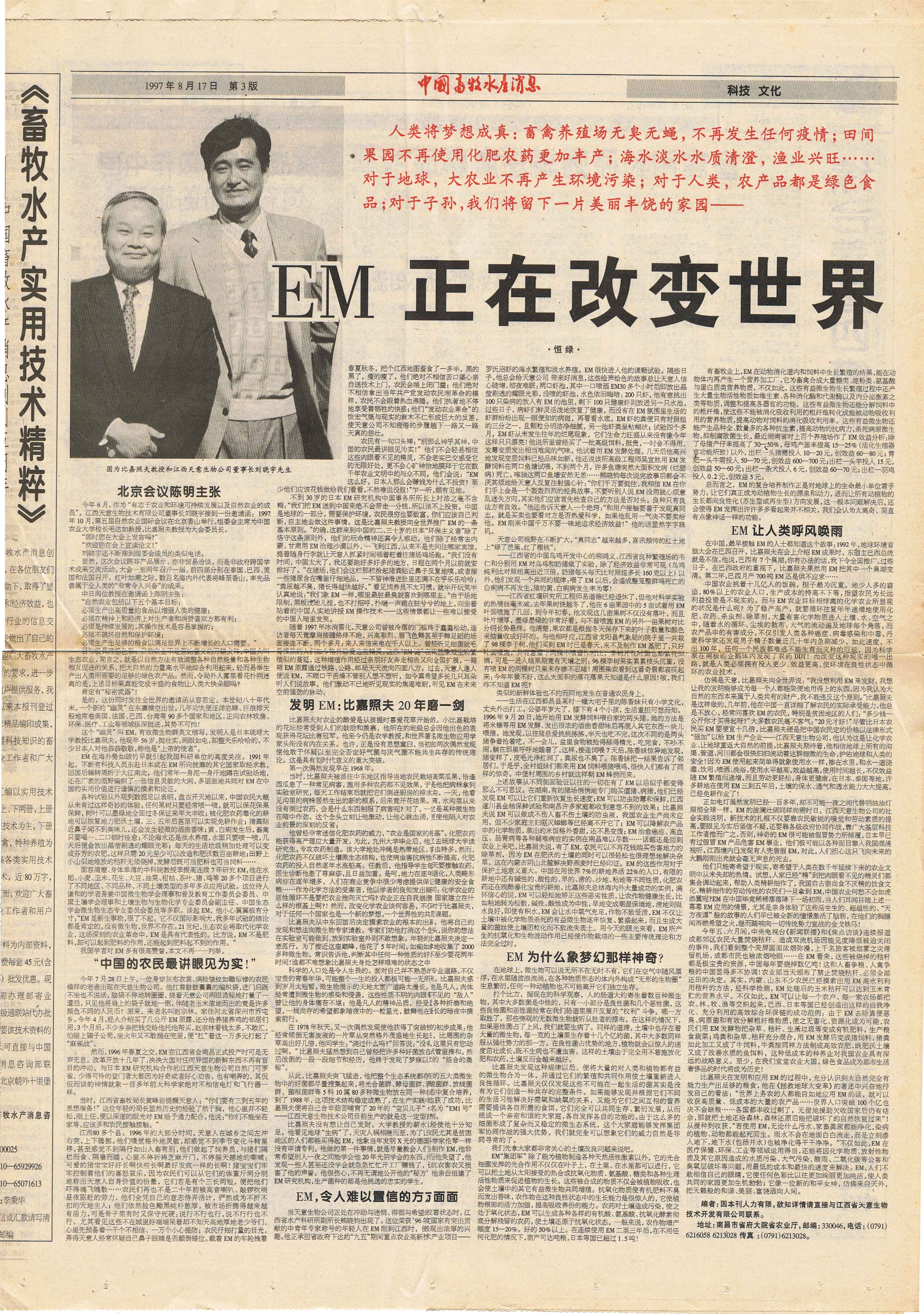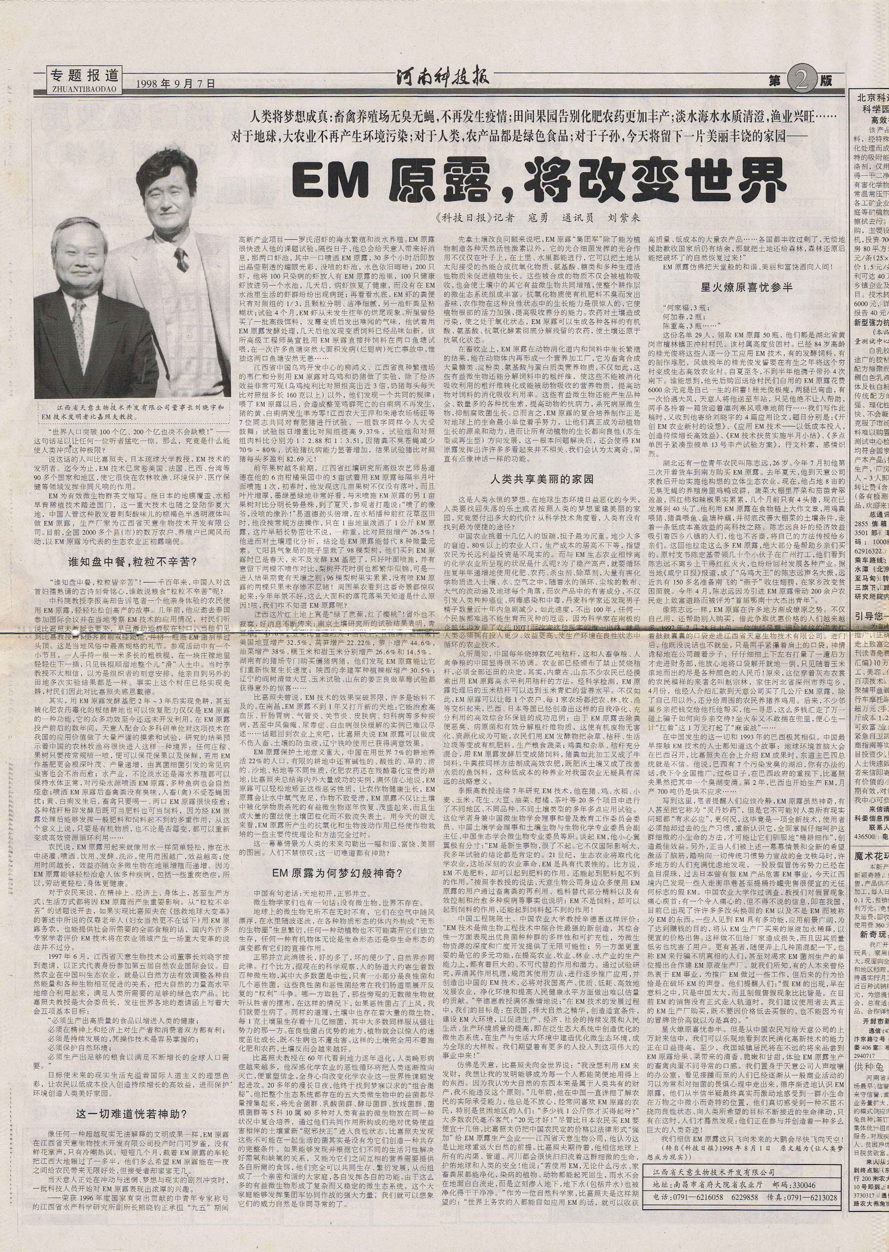 1997年,継《中國(guó)畜牧水產(chǎn)報(bào)》、《科技日?qǐng)?bào)》、《經(jīng)濟(jì)參考報(bào)》、《江西日?qǐng)?bào)》等媒體發(fā)表長(zhǎng)篇通訊《EM原露正在改變世界》,各省科技、農(nóng)業(yè)報(bào)刋均紛紛轉(zhuǎn)載,EM原露在江西最初的使用效果迅速在全國(guó)范圍內(nèi)興起了一股熱潮,兩年內(nèi)共簽定縣級(jí)代理合同500余家。