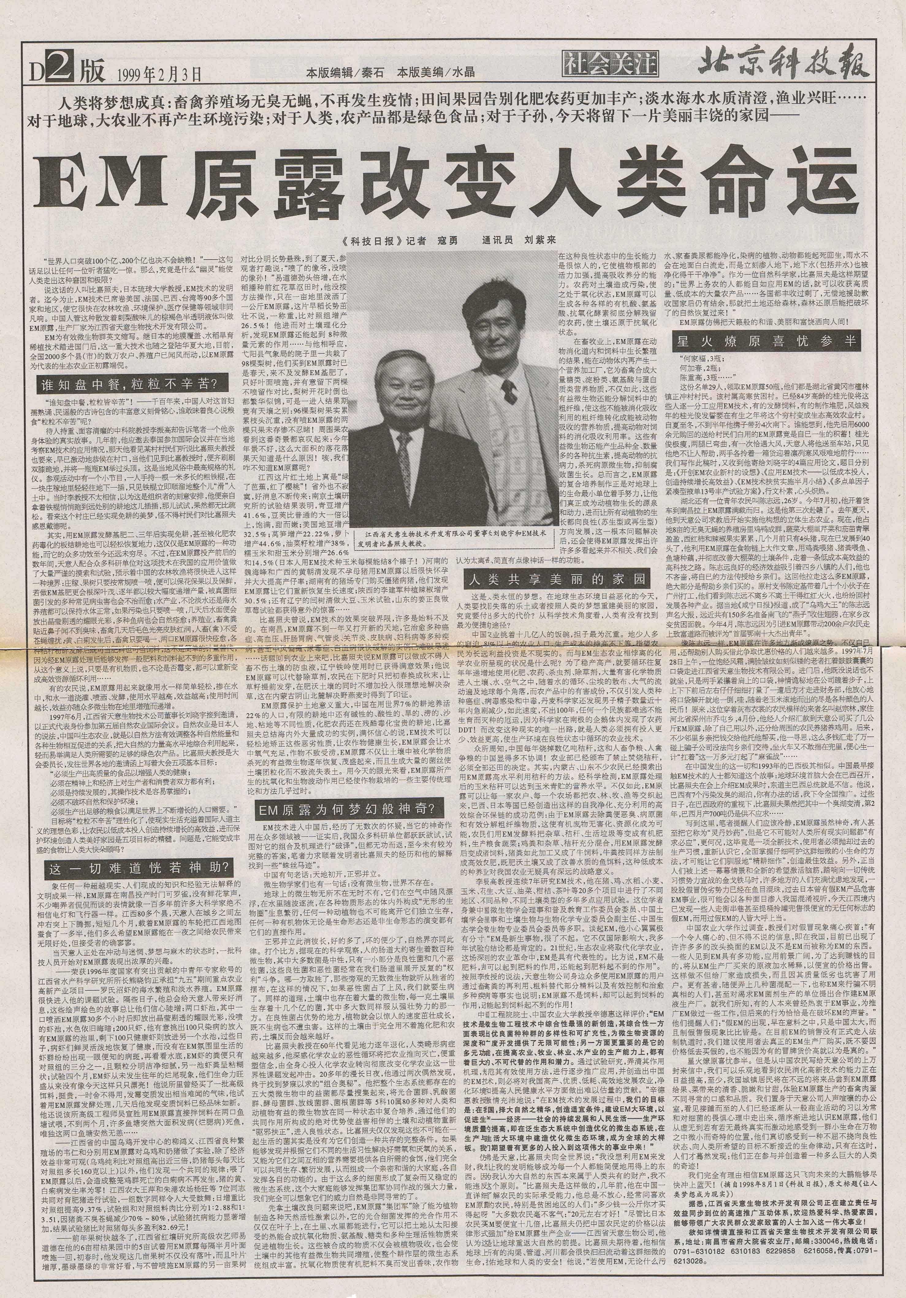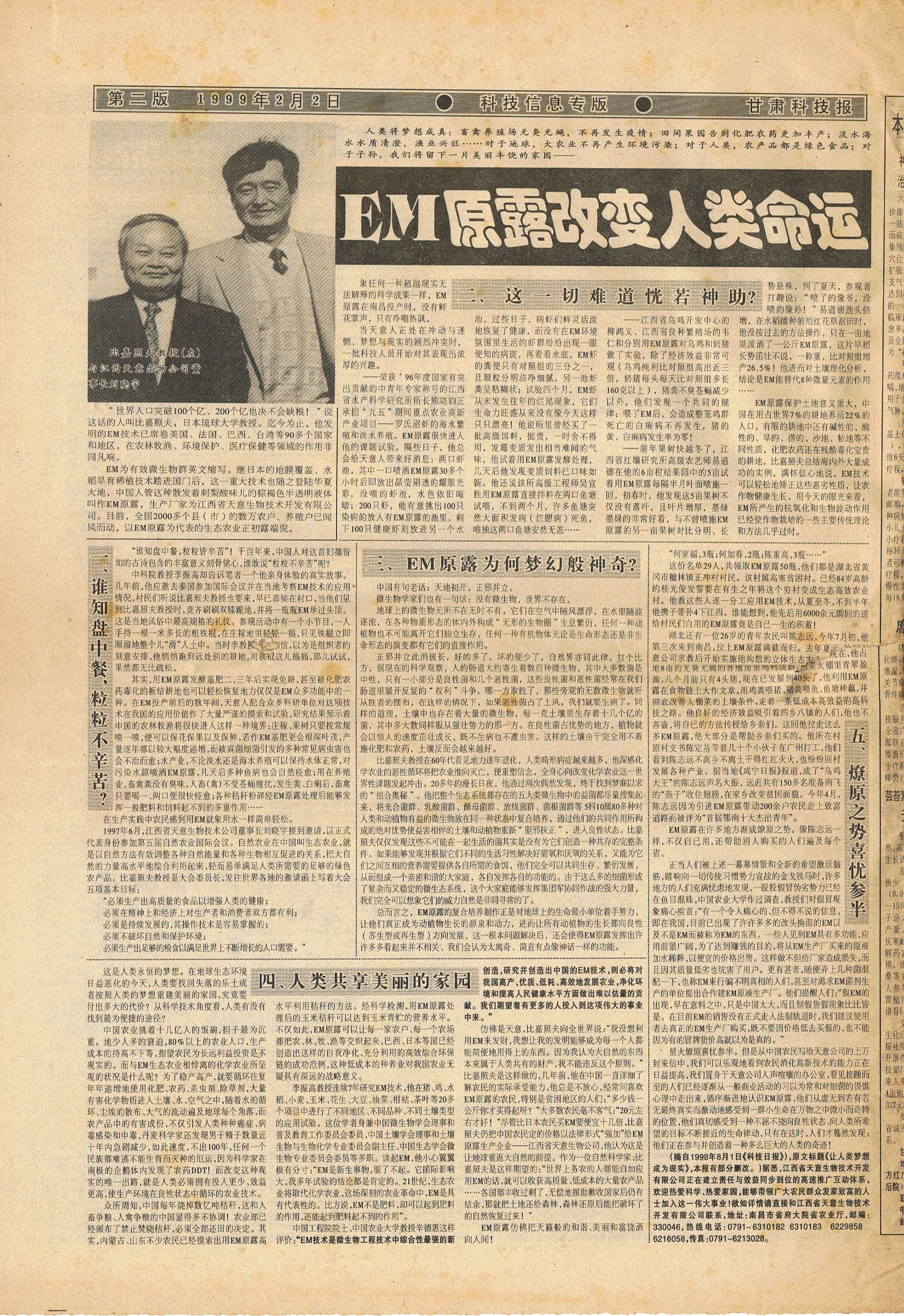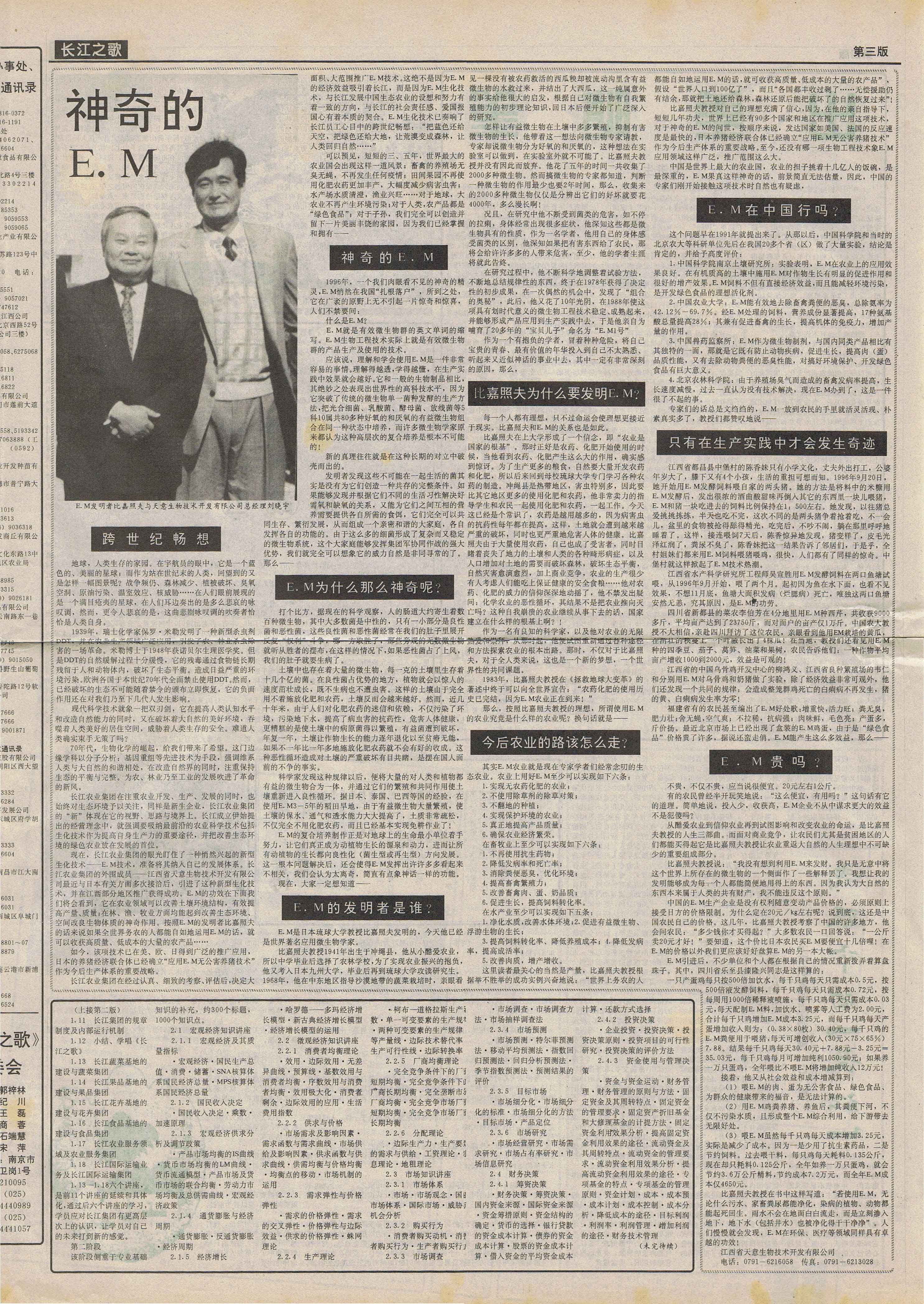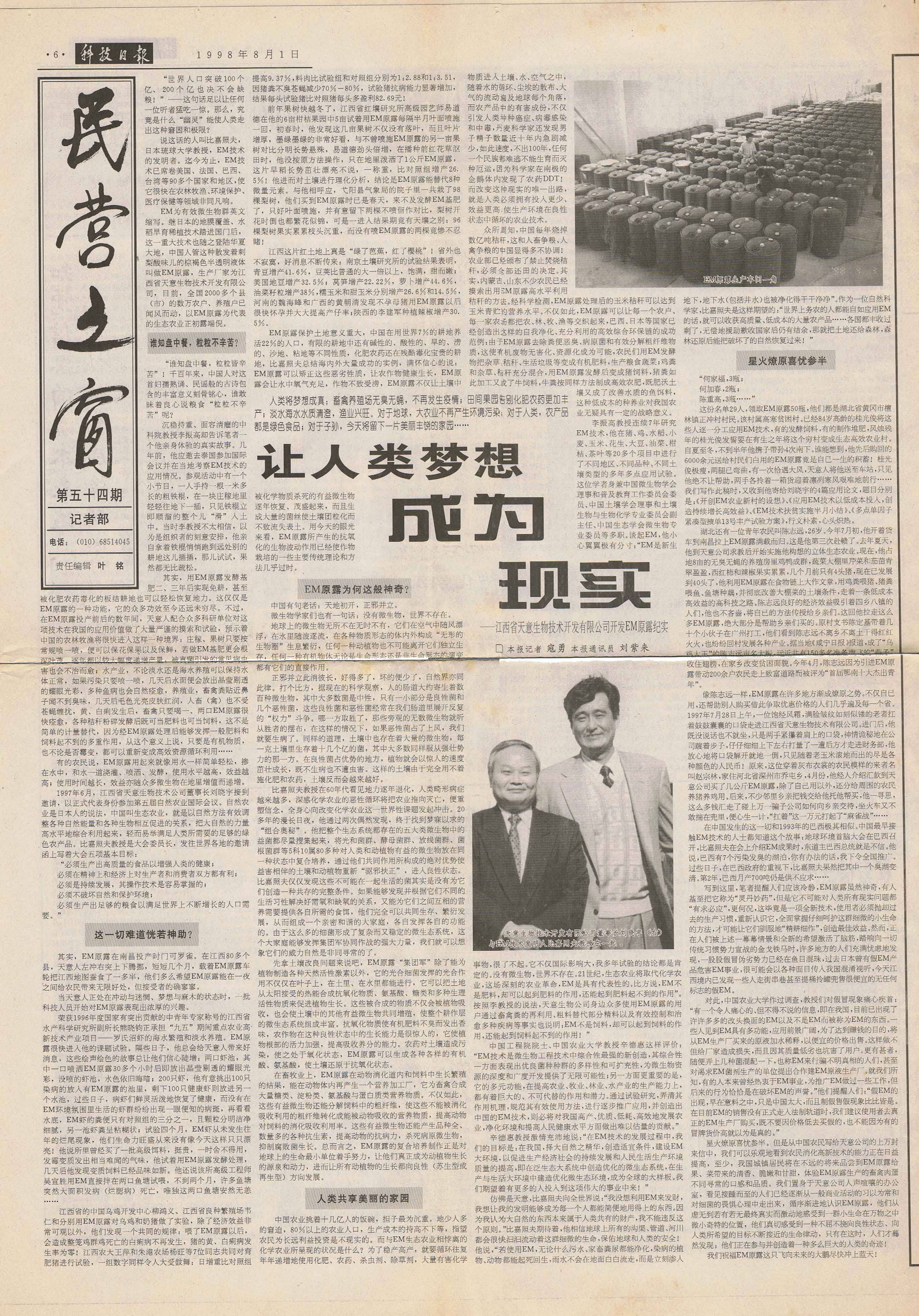 1997年,継《中國(guó)畜牧水產(chǎn)報(bào)》、《科技日?qǐng)?bào)》、《經(jīng)濟(jì)參考報(bào)》、《江西日?qǐng)?bào)》等媒體發(fā)表長(zhǎng)篇通訊《EM原露正在改變世界》,各省科技、農(nóng)業(yè)報(bào)刋均紛紛轉(zhuǎn)載,EM原露在江西最初的使用效果迅速在全國(guó)范圍內(nèi)興起了一股熱潮,兩年內(nèi)共簽定縣級(jí)代理合同500余家。